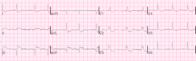 Скорая доставила мужчину за 40, с жалобами на интенсивные давящие боли в нижней части грудины, четко не связанные с физической нагрузкой, возникшие около 2-х часов назад и "плохой ЭКГ" (она представлена далее).Прикроватное Эхо дискинезов не выявило, тропонины и ферменты оказались негативными. Несмотря на инфузию нитратов и анальгетики, боль, хоть и несколько стихла, но сохранялась: