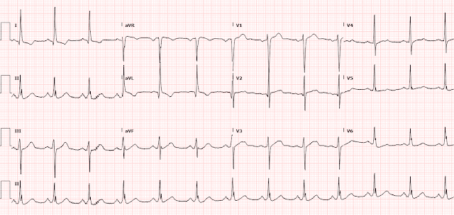 Сама по себе эта ЭКГ кажется почти полностью нормальной (люди с острым зрением могут увидеть аномальную ишемическую депрессию ST в нижних и боковых прекардиальных отведениях) кроме того, это самый большой подъем ST, чем на любой предыдущей ЭКГ.