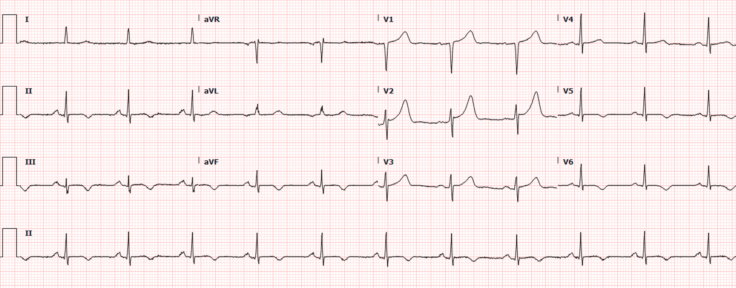 Я не интерпретировал ЭКГ № 2 как «нормальную». Я подумал, что в нескольких отведениях наблюдается минимальное неспецифическое уплощение ST-T, и я интерпретировал зубец T в отведении V2 как больший, чем должен быть, учитывая амплитуду комплекса QRS в этом отведении.